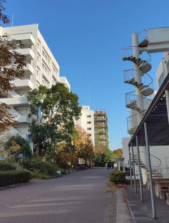 壁面緑化や藤棚がある建築学棟(奥)と電子情報工学棟(左)、螺旋階段が特徴の工学基礎研究棟(手前右)です。春の桜、藤の季節もとても美しく、ゆっくり歩きたくなります。